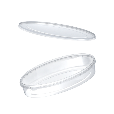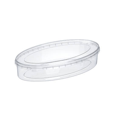 Пластиковая банка объемом 1,30 мл овальной формы — прозрачная порционная тара из сертифицированного пищевого пластика для производителей рыбных пресервов, икры, мёда, готовых салатов, джема, солений, творога, соусов и приправ.