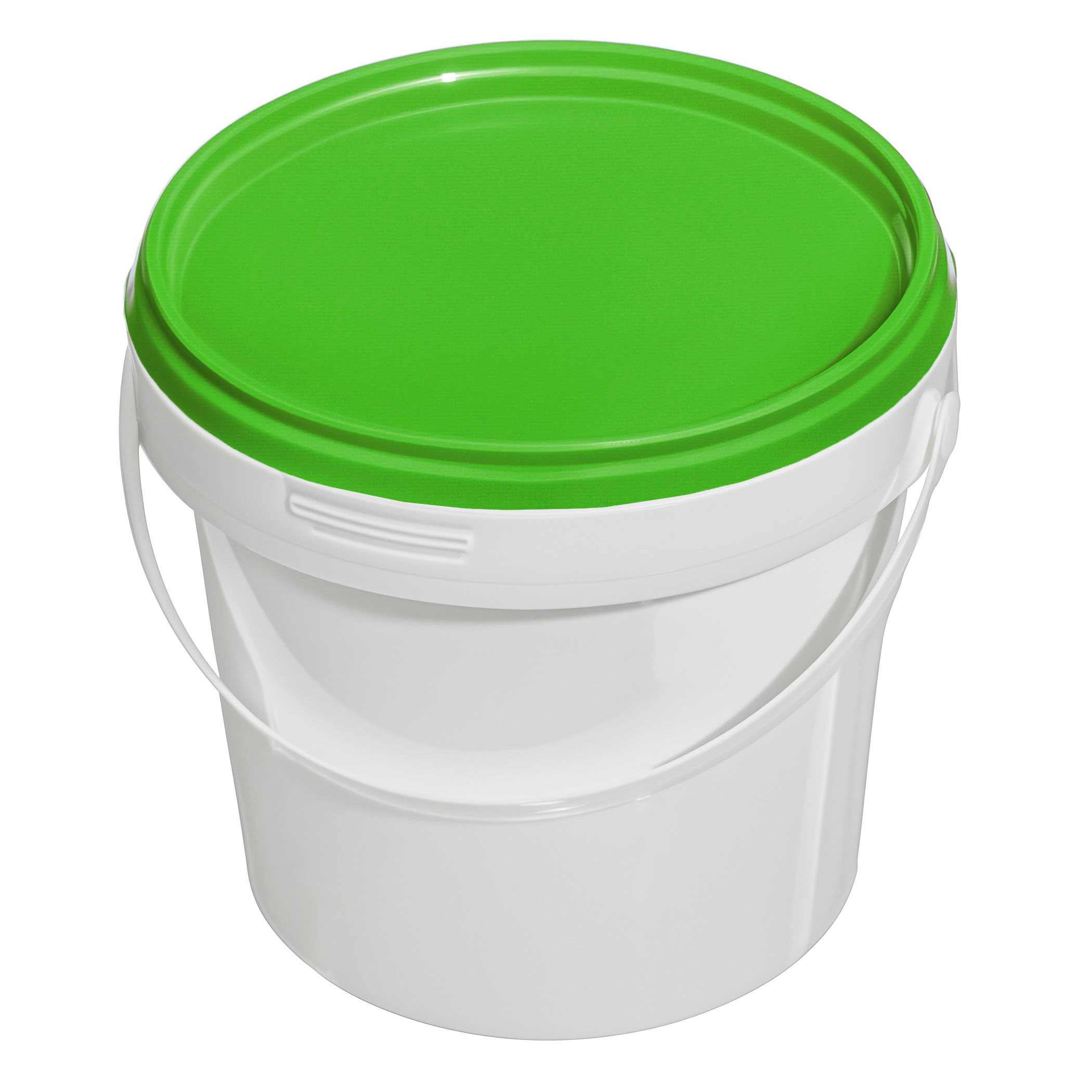 Белое пластиковое ведро объемом 1,1 литра, круглой формы, с ручкой, в комплекте крышка зеленого цвета. Предназначено для хранения и перевозки пищевой и/или промышленной продукции. Оптовые поставки в Тюмень