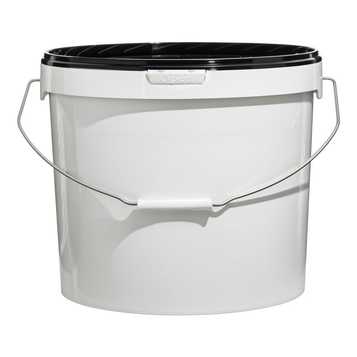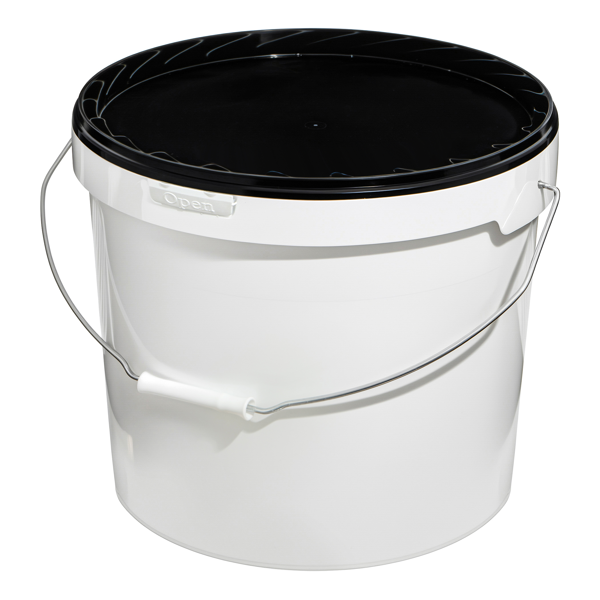 Ведро белого цвета из пищевого пластика объемом 17,7 литра с металлической ручкой (вес ручки - 57 г) и крышкой черного цвета. Форма - круглое. Трехконтурный замок. Подойдет для промышленного применения, использования в строительстве и торговле.