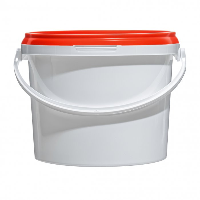Ведерко из пищевого пластика объемом 3,4 литра, с красной крышкой. Без запайки, легко открывается. Поверхность не маркая. Ведро подходит для хранения как бытовых, так и химических жидкостей и сыпучих продуктов.